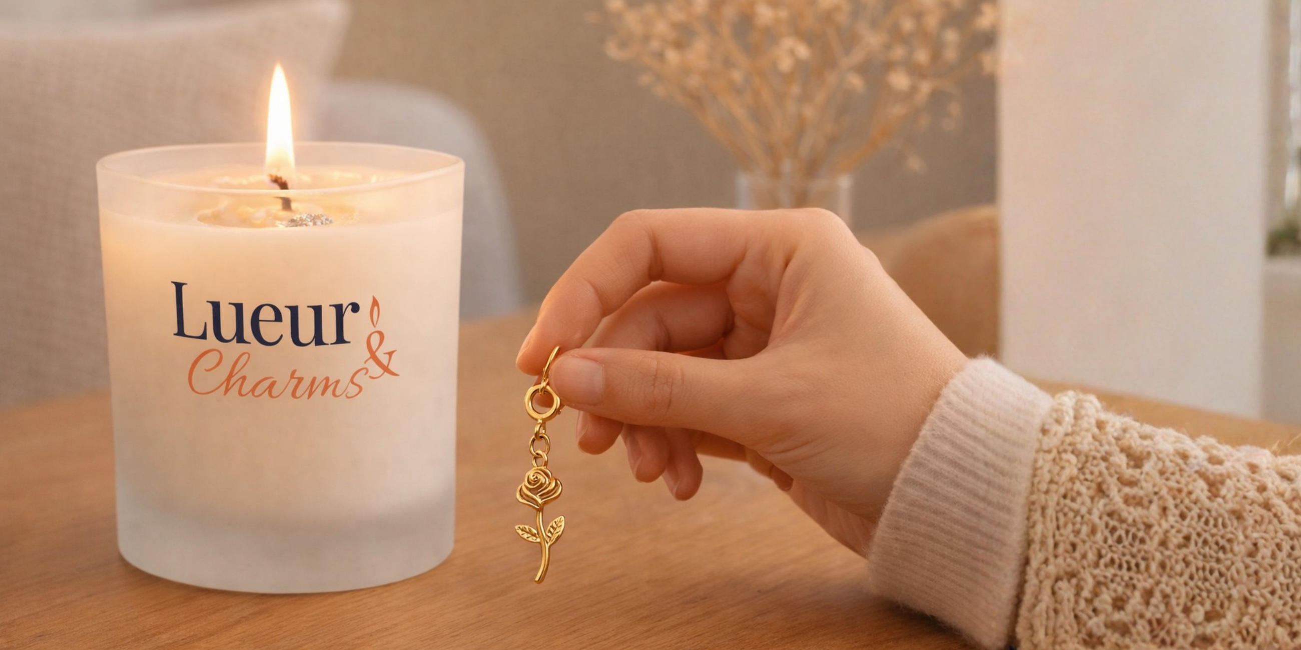 Chaque bougie Lueur&Charms cache un charm à découvrir. Un concept unique où la lumière devient souvenir, et le parfum devient bijou.